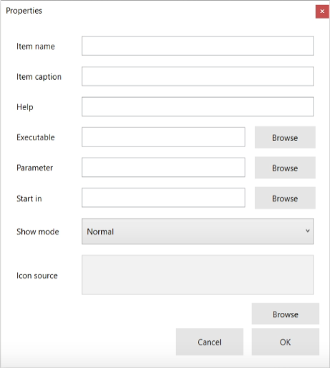 Right-click a group or item within a group and select Properties to open the Menu Group Properties or Menu Item Properties dialog, respectively.