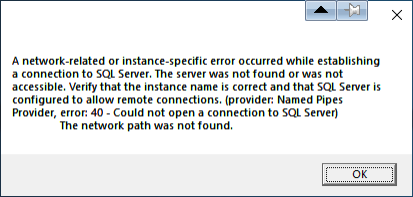 Cause: The server instance for the connection is a named instance, and either the SQL Browser service is not running on the database service or an incorrect port specification is configured in the CCLAS.INI file.