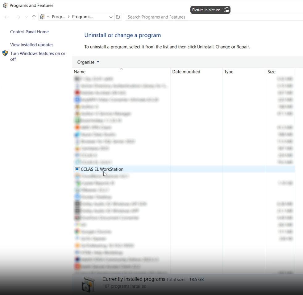 Upon successful installation, access the computer's Settings » Apps » Programs and Features list to see the CCLAS EL Workstation application.