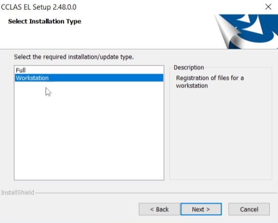 Select a Workstation installation to register the CCLAS EL components on the device, then click Next to proceed with the installation.