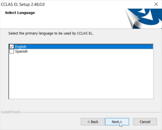 Select the default language for the CCLAS EL application, then click Next to proceed with the installation.