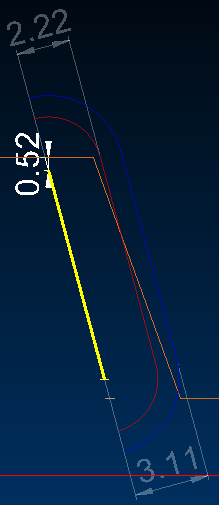 The following screenshot displays the burden check for a hole that does not meet the minimum burden requirements. The explosive column is yellow, with a stemming length of 0.52 m and there is a standoff. The face burden surface is in orange. For this hole, the minimum burden distance is 2.22 m, which is shown in red. The maximum burden distance is 3.11 m, which is shown in blue.