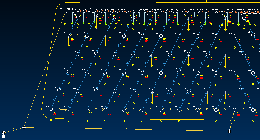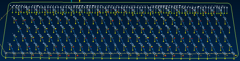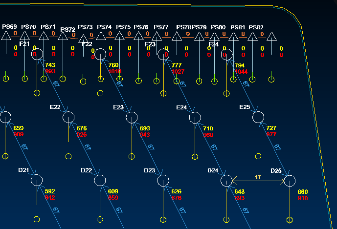 4: Continue to tie up the initiation pattern. Set the auto search width to 0.8. Use the (yellow) EZTL 17 product to connect the row of holes from A1 to A27. Use the (blue) EZTL 67 product to connect the other production holes diagonally from row A; that is, connect A2 to B1, then A3 to B2 to C1, and so on. On the right-hand side of the initiation pattern, connect holes D25 to E25 to F24. Save changes.