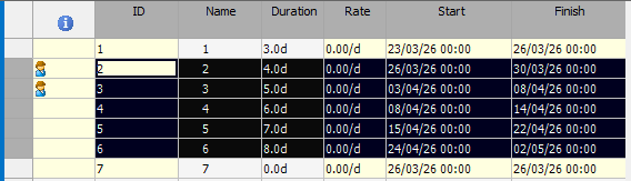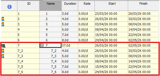 Continuing the example, above, if the work package was edited to be "type 4" (replace the primary task with the work package), and dragged onto position 7 in the list, the result is: