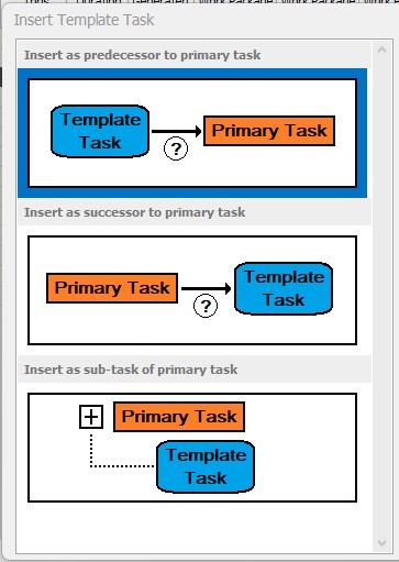 Primary Task + Template Task – Insert the new task under the primary task as a sub-task. In this scenario, dependency settings (type, lag and so on) are derived from the parent task and cannot be set independently.