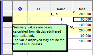 Assume you have applied a grouping, resulting in summary bars being displayed. Assume also that a filter has been applied resulting in some sub-tasks not being displayed. The question now arises as to whether the summary bar should show the summary of all tasks that normally fall under the summary, or only those filtered tasks that currently fall under the summary. Either way, there is the possibility of misinterpreting the results.