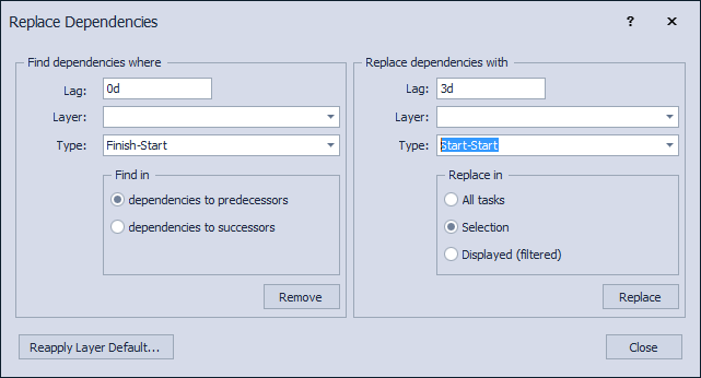 - Specify the tasks for which to replace the selected dependencies (All tasks, Selection, Displayed)