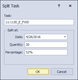In the Split Task form specify either the date, quantity (for fixed rate tasks) or percentage complete to split the task at.