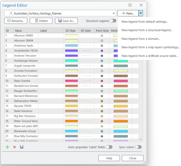 This enhancement applies to the following dialogs: New, New legend from default settings, New legend from a structural legend, New legend from a domain, New legend from a map layers symbology, and New legend from a drillhole source table. By centring these windows, you’ll always have a clear, organised view, making it easier to create and manage your legends without losing focus or having to drag windows around.