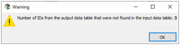 If some values from the output ID variable have not been found in the input data table, a message is popped up at the end of the run to indicate the number of invalid IDs (it is also reported in the Messages window).