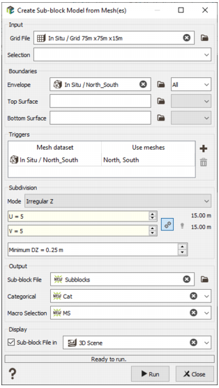 You need an existing 3D block model (a regular grid) to define the geometry of the parent cells and a set of 3D mesh files. The mesh files can be used to define the boundaries and/or make the sub-division into multiple domains.