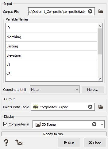 - Output Points data table: Name the points file to create in the Isatis.neo project. The import task will create a new file on the Data Tree (or overwrite if you enter a name that already exists).