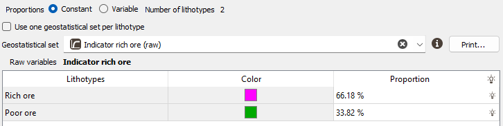 The Variable option corresponds to the Non-Stationary case. Therefore, the Lithotypes proportions can vary in space. This option is activated by clicking on the toggle Variable.