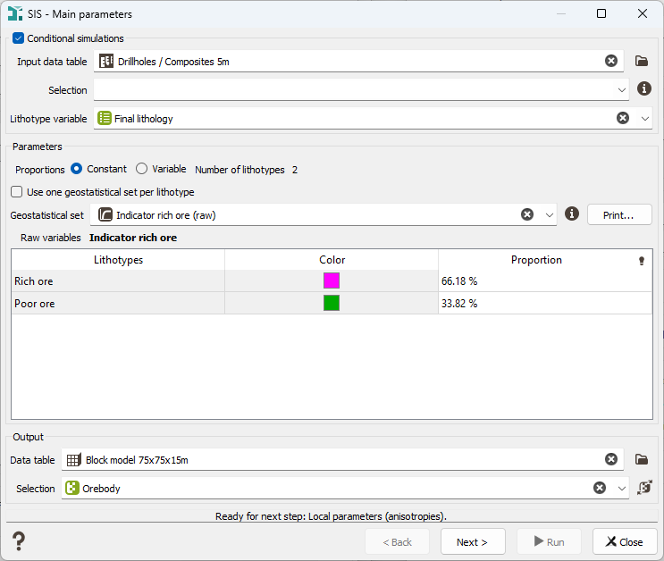 Select the Conditional simulations option to constrained all simulations to all the active information. Information of data required for conditioning is displayed: Input data table, an optional Selection to limit the input samples and the Lithotype variable to be simulated. Lithotypes must be defined through a categorical variable.