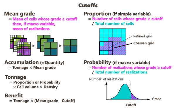 Benefit: corresponds to the difference between the metal quantity you should obtain with the calculated grade and the metal you would have obtained if the blocks had the exact cutoff value, so a value lower than the grade value.