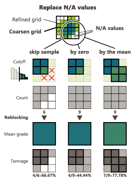 Replace undefined values: If for some reasons, some fine-grid cells are not informed (the estimation / simulation returned N/A), these cells can be skipped (default option) or they can be patched with a grade equal to zero or patched with the mean of the associated coarse cell.