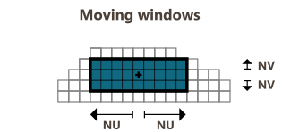The Moving mode defines a neighborhood centered on each input grid cell. The neighborhood is specified by a fixed number of cells. The neighborhood is rectangular and requires the definition of an extension around the cell of interest in each direction U/V(/W). A feedback is provided to display the actual number of cells in the window based on the specified extensions.