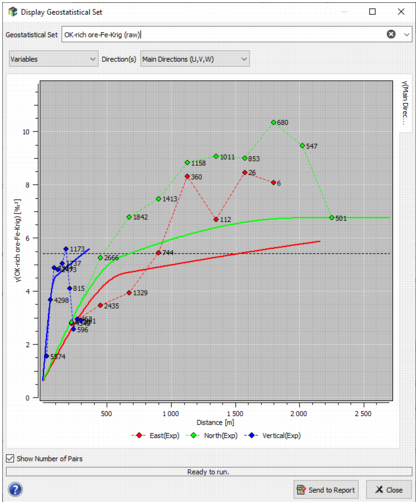 Click Run to save the computed experimental variograms and the associated model in a Geostatistical Set. The computed variogram(s) will be displayed in a pop-up window at the end of the run.