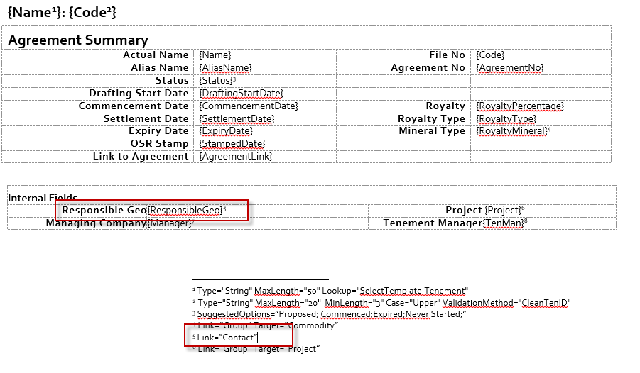In default templates, we have created field property references that are used by LandTracker to identify when certain fields should have additional properties attached to them. Use Microsoft Word's Insert Endnote tool to create your own field properties.