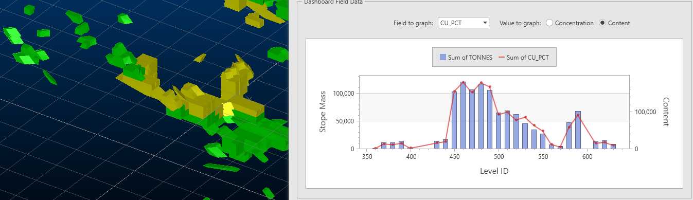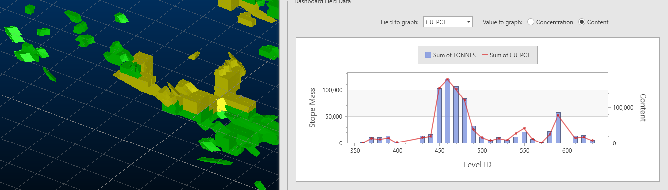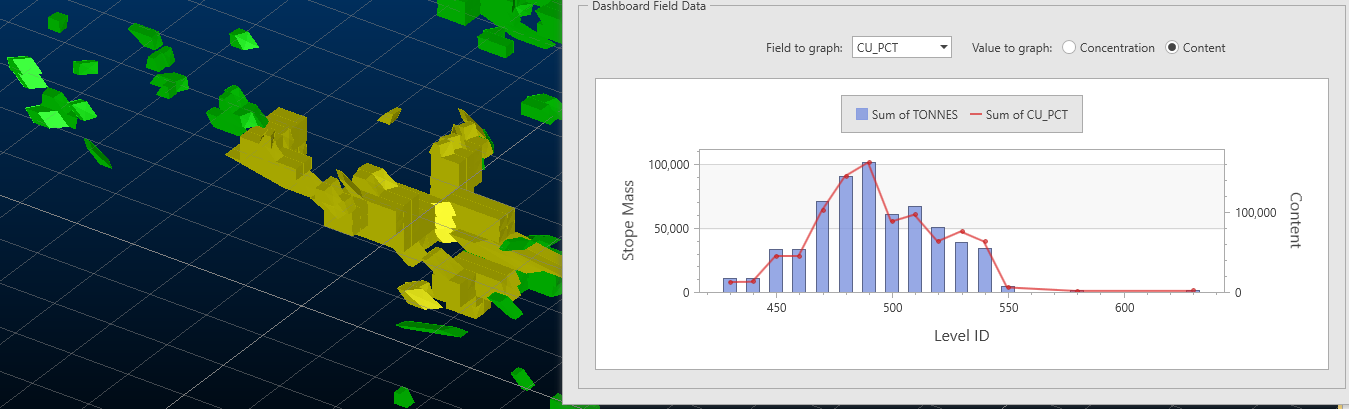 The left axis is for the stope mass, represented by the blue bars. The right axis is related to the selected field element, represented by the red line, for example: