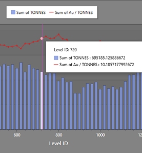 Moving the mouse arrow over the summary chart will display window with detailed values for stope mass (or volume) and the selected field element for each level, for example: