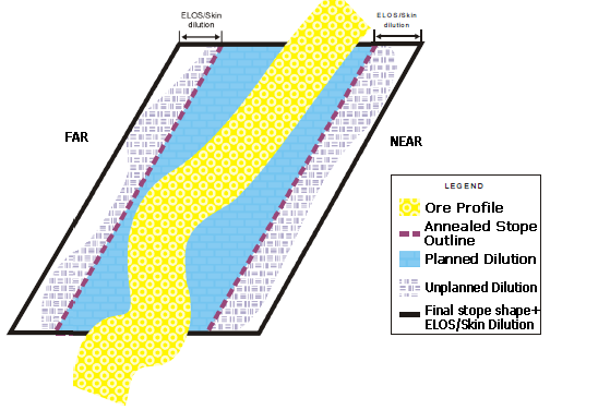 In the Slice framework, the annealed stope shape includes planned dilution which is the waste material necessary to extract the ore. Unplanned dilution is material that originates outside the stope boundaries. To factor in unplanned dilution that originates from outside the stope boundaries from the HW/FW or Near/Far a dilution ELOS/Skin can be specified.