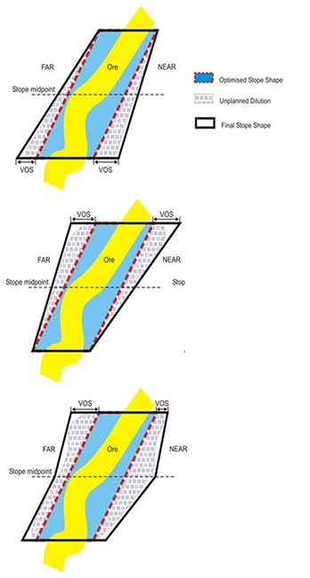 Volume Overbreak Slough (VOS) models dilution as volumes surrounding the stope, offering more flexibility for defining asymmetric or staged dilution—useful for bulk mining.