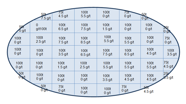 With geometry-based reblocking, adjacent blocks are combined into larger blocks. Typically this happens only within a bench. For example 10x10 blocks can be combined into 50x50 blocks. It is important to understand that when there are stockpiles or alternative processes, scheduling destination decisions will be made based on the combined block. That is, whatever happens to the combined block can be considered to effectively happen to every original block of the combined block.