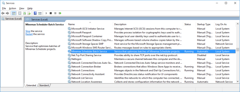 The Batch Service is installed during the installation of Minemax Scheduler and can be viewed under the Windows Services Manager.