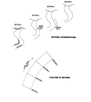 Figure 2, further below, shows a simple example of sections through a stratified deposit. A plan showing the strike of the orebody is also shown in this figure. The unfolded coordinate system (UCS) has 3 axes, A, B and C: