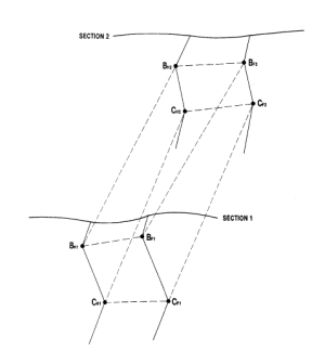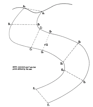Figure 5 shows the median line AM BM CM DM EM FM for section k. The length of this line is denoted BLEN . The average length of the down-dip axis is then calculated as the weighted average of the k BLEN values over all sections. The weights used are the distance of influence of each section ie k half way to the next section measured along the C axis.