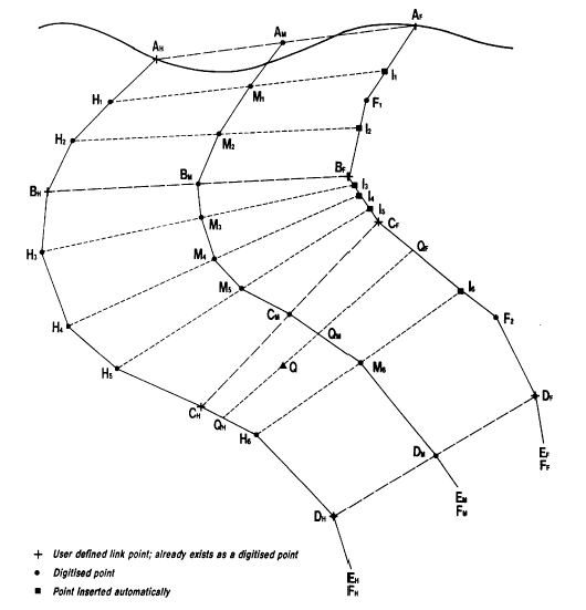 For all other digitized points on the hangingwall (H1 , H2 , etc) and footwall (F1 , F2 , etc) strings, the linking is done automatically as follows:
