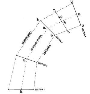 The method described so far assumed that point Q lies exactly on section. In order to calculate the A and B coordinates for a point lying between sections k and k+1 the above process must be extended to three dimensions. This involves linking points between sections in a similar manner to the linking within sections described previously. In the following description AH , BH etc are again used to denote points linked by the user, and Hi are intermediate points on the strings which are linked automatically. However it should be noted that although a point on the hangingwall may be linked by the user to a point on the footwall within a section, it is not necessary that the same point is linked by the user to a point on the next section.