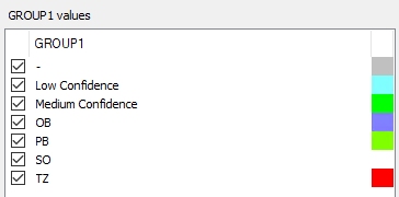 In the above example, there is an absent (-) value indicator (always present), two group values representing confidence and a set of four distinct lithological values which have no grouping.Double-click a label to edit the name of a listed lithology item or group