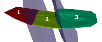 In the following example, 3 fault sheets are used to split modelling output into four fault blocks. All fault wireframes fully intersect each other, although they don't have to: