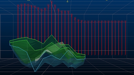In the example, below, a series of holes at 100m spacing have been added from East-West, snapping the target to the volume's upper surface. The final holes are position at the same elevation. The wireframe is shown with front clipping and an overlaid intersection line:
