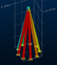 For example, in the image below, a collar position is shared by 12 holes of equal length, varying by 40 degrees in Azimuth between successive holes (and a dip of 80 degrees for all):