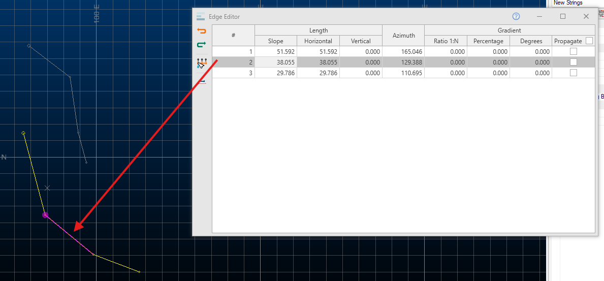 By default, edge properties are calculated from the start to the end of the edge. You can change this using the Reverse Active String toggle. This automatically updates the values in the table to reflect the new direction of measurement.