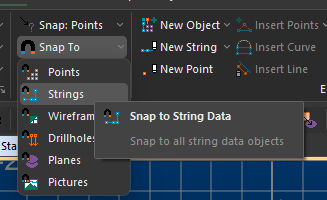 You can snap to string data if the appropriate snapping mode has been set. How you do this depends on your application; for example, the Studio EM application's Home ribbon features a Snap to menu that determines which loaded object data (if any) can be snapped to during digitizing: