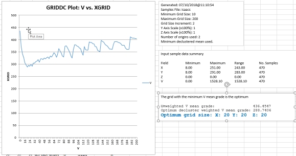 You can plot XGRID on the X axis against V on the Y axis of a line chart. It can be seen from the graphic that the decluster weighted mean grade (V) decreases until the X grid size reaches 20m and then starts to increase. This shows that the optimum grid size is 20m in X. In this example XFACTOR and YFACTOR are both 1 so the corresponding grid sizes in Y and Z also 20m.
