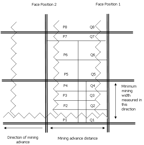 The dimension in Y is calculated as follows. The zone and BREAK values of cross-section XZ are calculated by applying the zone rules to the material intersected by a plane defined by P1Q1 in plan and extending by the face height in a vertical direction. This plane is then pushed backwards (in the positive) Y direction in Figure 1) until it crosses a sub-cell boundary (P2Q2). The zone and BREAK values of this new plane are calculated. If any of these values have changed then the current slice is terminated and a new slice started. If none of the values have changed the XZ plane is pushed back to the next sub-cell boundary (P3Q3) and the process is repeated until the total model has been divided into slices with constant zone and BREAK values within each slice.