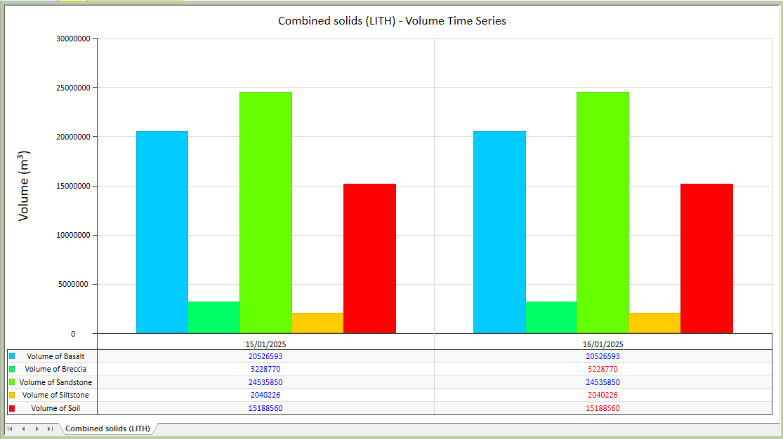 Each time you generate a combined solid, a record of the corresponding structure volumes is appended in your project folder (this file is called reports.xml). Where historical data exists, say from a previous run (prior to the update of drilling data), data displays showing the change in volume(s) over time.