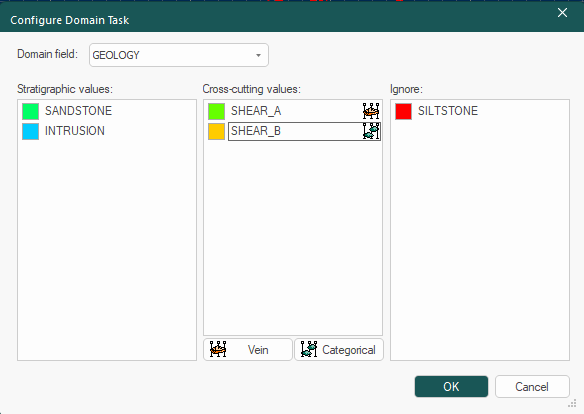 For each Cross-cutting value, select it and choose if it is to be modelled as either a Vein or Categorical volume (the list item icon updates accordingly).