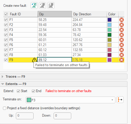 Trace data will always include two attributes to represent the Dip of the trace and the Dip Direction. Where a single fault trace is extruded to form a fault sheet, the dip is 90 (vertical) by default, and the dip direction is calculated according to the average dip direction of each edge of the trace object.