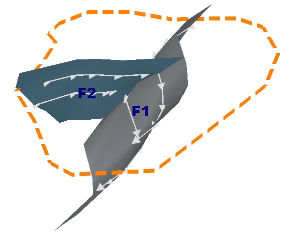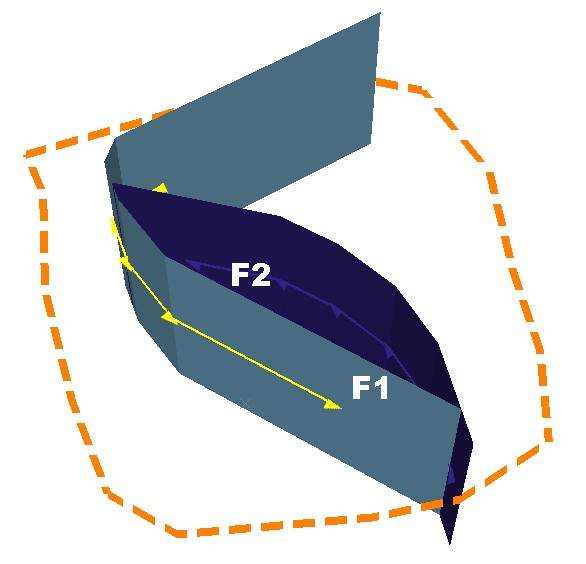 As another example, the fault system below represents two faults that represent a sigmoidal arrangement. Fault F1 Stops on Fault F2, and Fault F2 Stops on Fault F1. Both faults extend to a custom boundary: