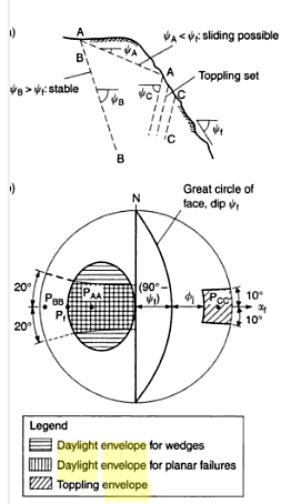 Similarly, where a discontinuity set dips into the face, it is not possible for sliding to occur, but toppling is possible. The position of these poles in relation to the slope face may show that the poles of all planes that daylight (and are potentially unstable) lie inside the pole of the slope face. This area is known as the Daylight Envelope and can be used to quickly identify unstable blocks. *