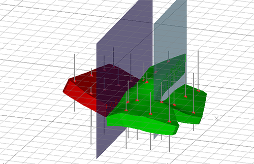 In the following example, 3 fault sheets are used to split modelling output into four fault blocks. All fault wireframes fully intersect each other, although they don't have to: