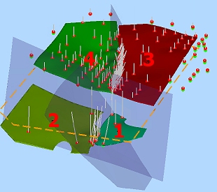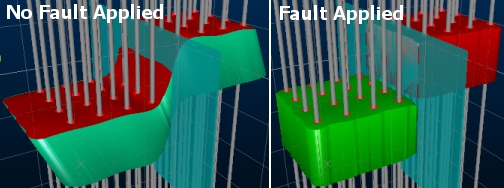 Where a fault sheet either fully transects the positive sample data extents, or it fully intersects with another fault sheet, a discontinuity is created representing the typical shear or thrust expected in nature. This scenario gives rise to fully-independent fault blocks.