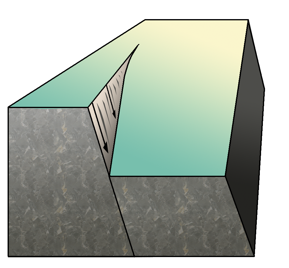 However, fault sheets can terminate within a fault block. In this situation, the fault throw is gradually reduced to zero up to its terminus, allowing a 'scissor fault' to form, for example, the green fault block below is partly intruded by a fault sheet: