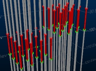 In the examples below, a 4x8 grid of positive intervals (two groups of data at different elevations, representing a 10m shear). Regular 20m spacing exists: